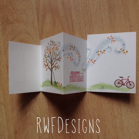 Het idee van France Martin deed me denken aan het liedje 'kleuren van de wind' uit de Disneyfilm Pocahontas. Bij deze getrapte zig-zag kaart heb ik de afbeeldingen doorlopend gestempeld op de 3 grote flappen, zodat je echt het idee van een briesje krijgt. De boom heb ik op de voorste flap herhaald. Doordat dit een photoplymer stempelset is, kan je deze boom uitlijnen met de boom op de tweede flap.
